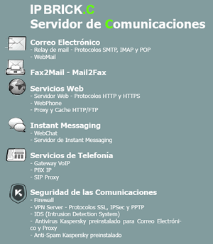 IPBrick .KAV fue concebido para que a través de un servidor de comunicaciones contenido en un appliance diseñado con elevada integración a nivel de hardware , del sistem a operativo de red IPBrick .IC y softw are de seguridad de Kaspersky Lab, aumentar la seguridad de las redes empresariales.